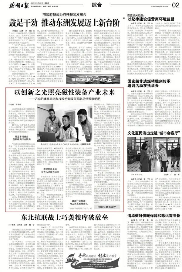 該專(zhuān)訪(fǎng)報(bào)道以《以創(chuàng)新之光照亮磁性裝備產(chǎn)業(yè)未來(lái)》為題,已刊發(fā)于2025年11月20日《撫順日?qǐng)?bào)》第二版。