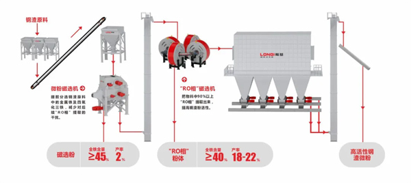 沈陽(yáng)隆基在鋼渣微粉“RO相”提取中取得技術(shù)突破,解決了鋼渣微粉建材化利用存在配比低、活性低等問(wèn)題。鋼渣微粉全鐵含量由18%降低至8-10%,鋼渣復(fù)合粉體達(dá)到S95級(jí)甚至更高,“RO相”產(chǎn)率18-22%,全鐵含量≥40%,磁選粉產(chǎn)率2%,全鐵含量≥45%。