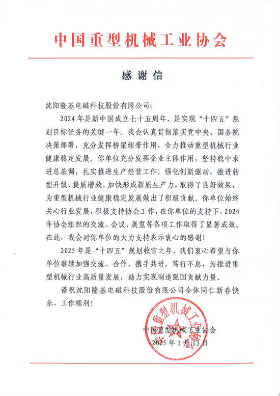 這封感謝信不僅是對沈陽隆基過去一年在重型機械領(lǐng)域不懈努力的肯定,更是對沈陽隆基未來發(fā)展的鼓勵和期許。2025年,沈陽隆基將繼續(xù)全力支持協(xié)會工作,篤行不怠,為推進(jìn)重型機械行業(yè)高質(zhì)量發(fā)展,助力實現(xiàn)制造強國貢獻(xiàn)力量。